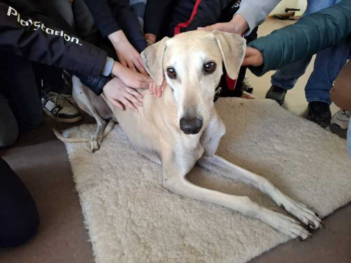 Seit 2019 Jahr ist Ella fester Bestandteil in unserem Schulleben. Ella ist ein spanischer Windhund mit einem ruhigen und ausgeglichenem Charakter. Im Umgang mit den Schüler:innen ist sie ausgesprochen liebevoll und jederzeit in jedem Klassenzimmer herzlich willkommen. Ihre Eignung wurde durch einen Wesenstest, den sie hervorragend bestanden hat, bestätigt.